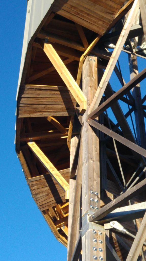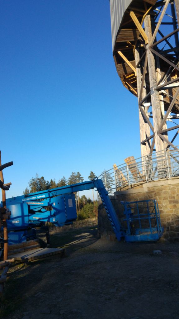 Fotografie na konci galerie ukazují současný stav prací na opravě poškozeného schodiště rozhledny na Velkém Kosíři - upevňování vzpěr schodiště k hlavním pilířům rozhledny.