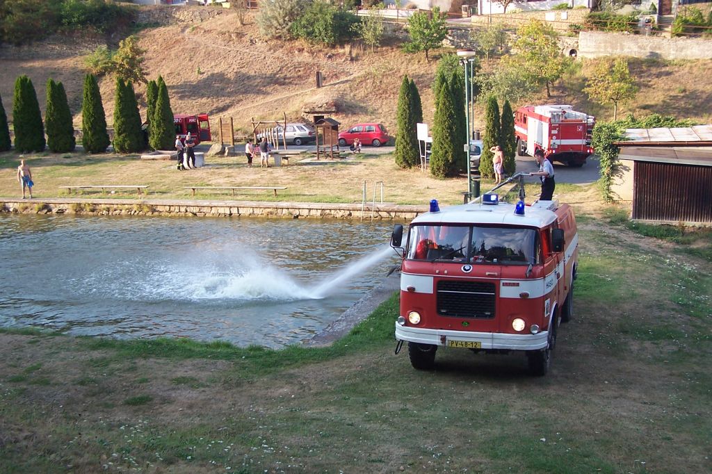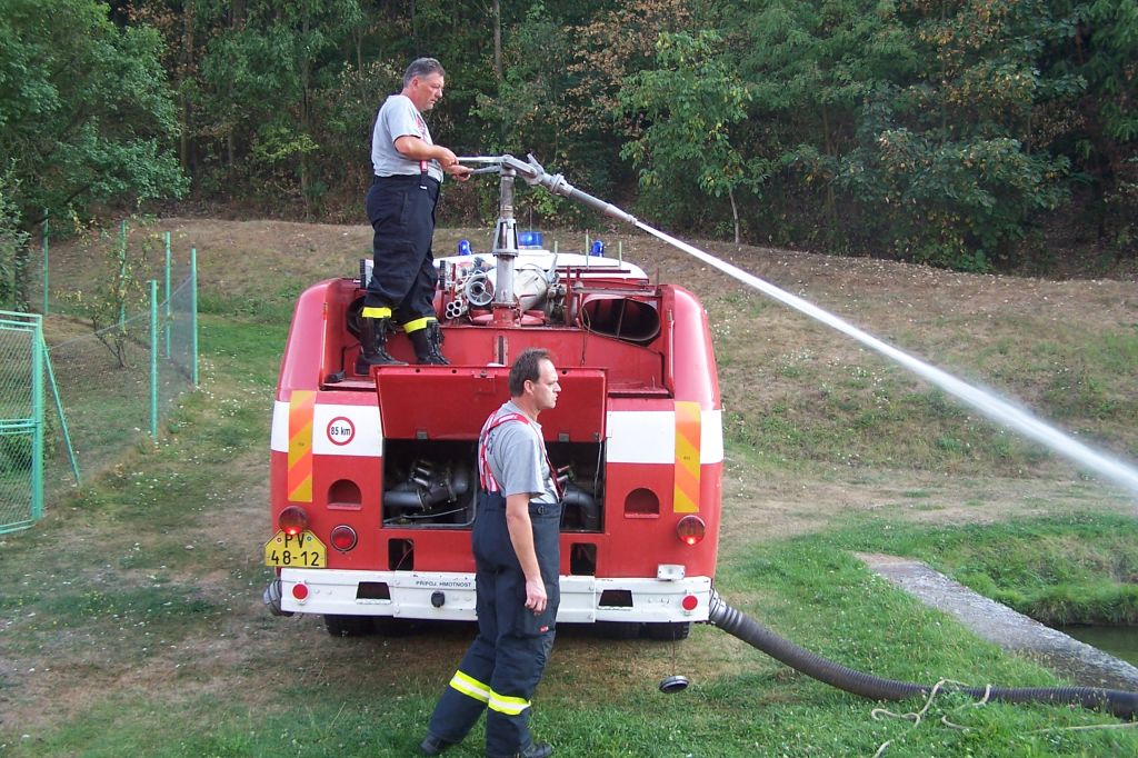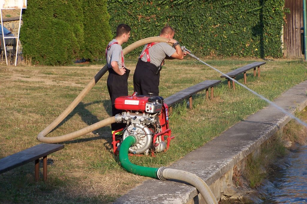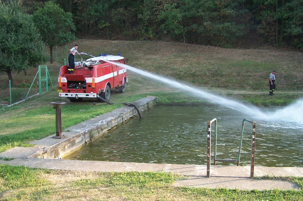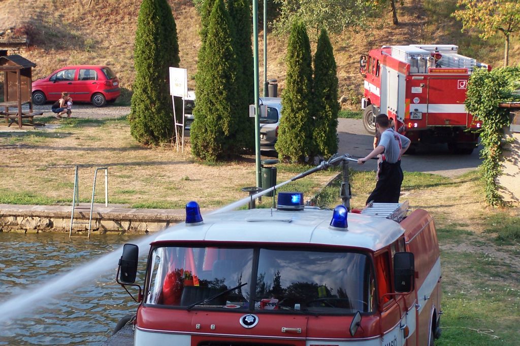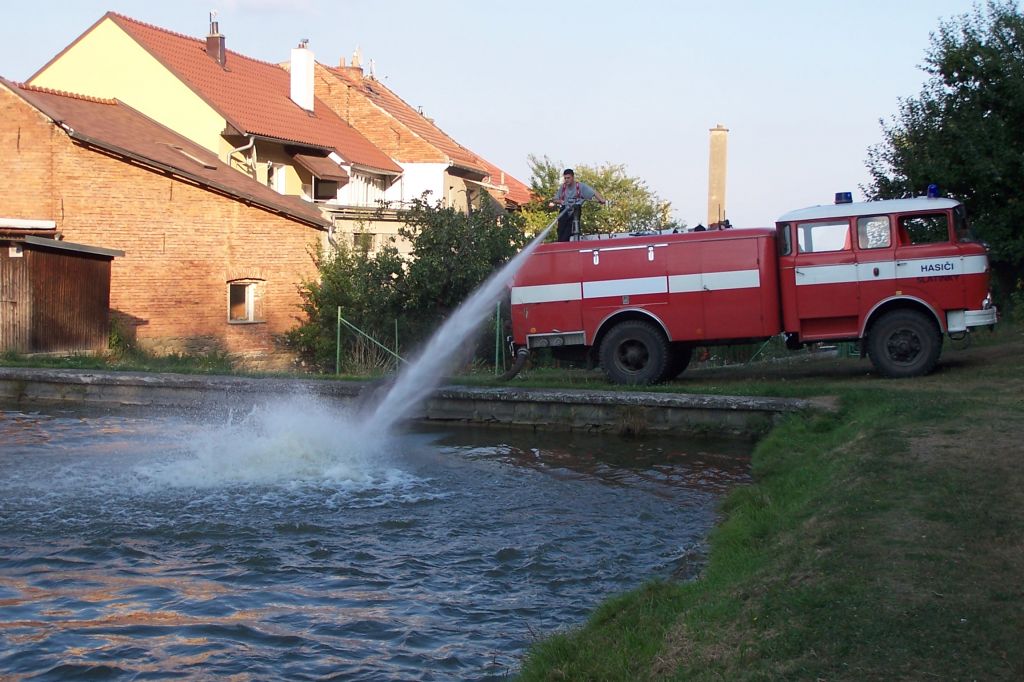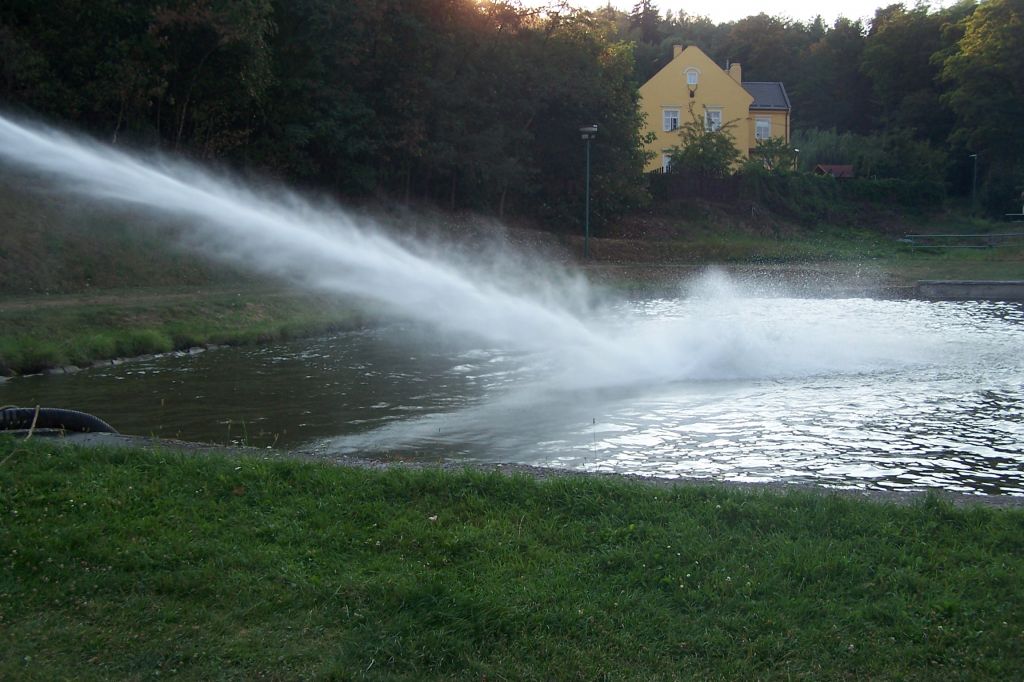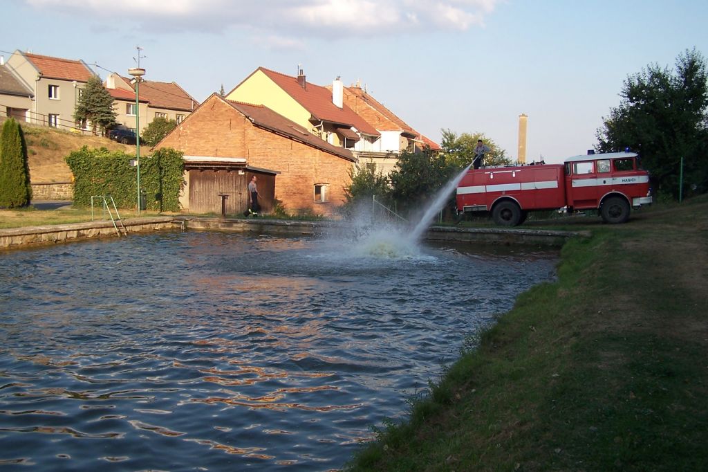 Extrémně horké počasí nesvědčí ani rybám v našem rybníku. Čeřením dostat do vody co nejvíce kyslíku - záchranná akce našich hasičů snad napomůže k přežití rybí populace.