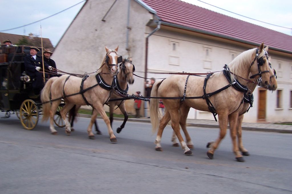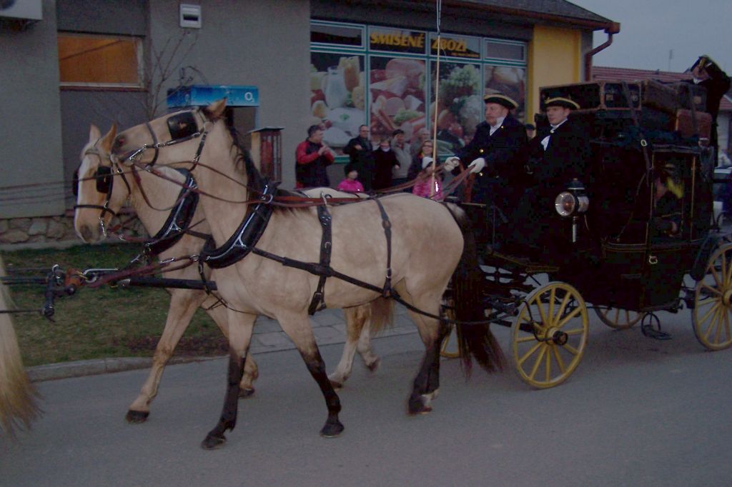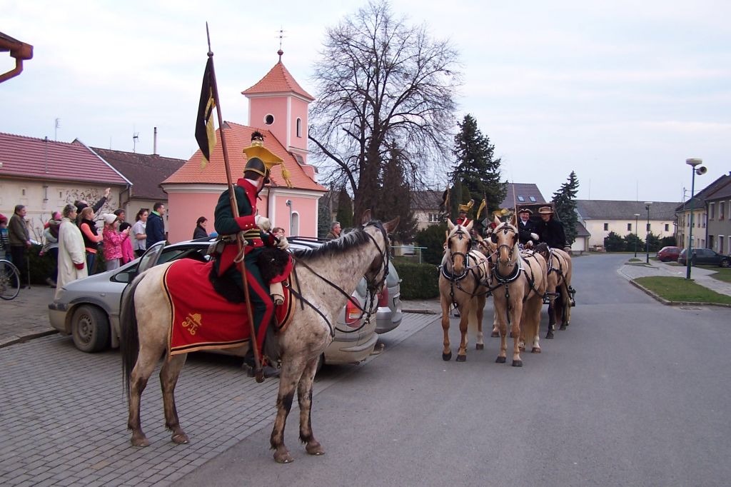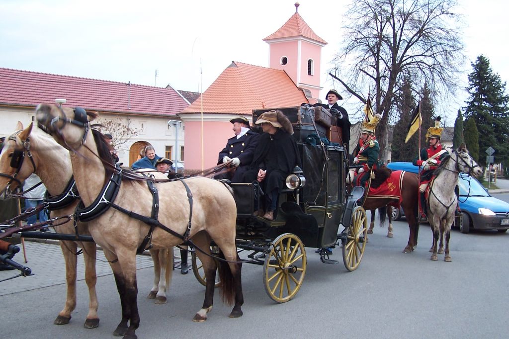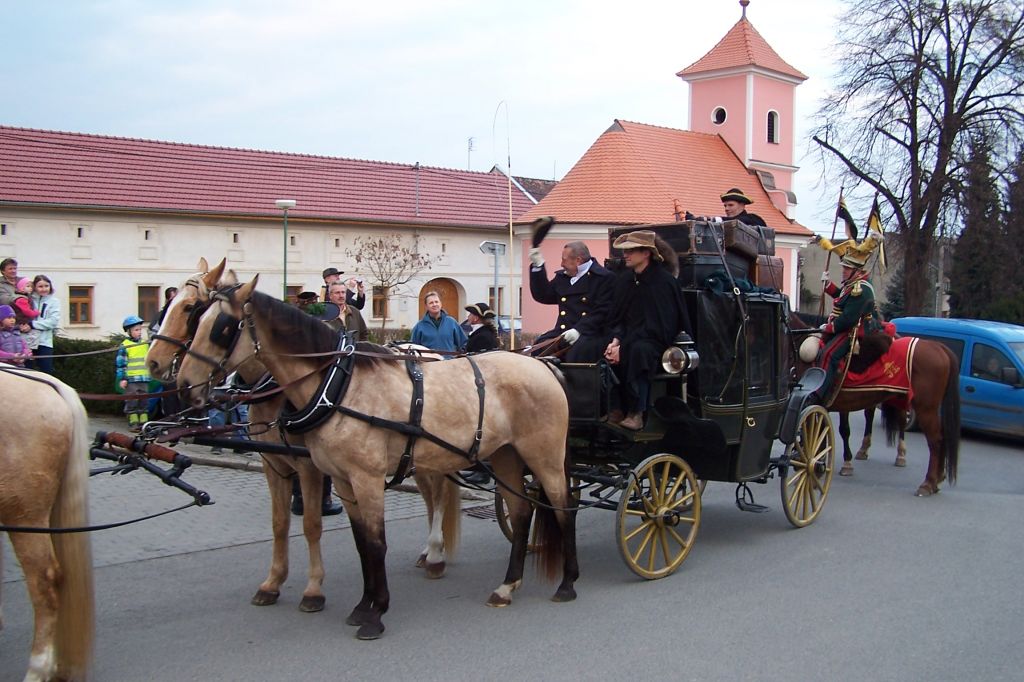 Pod prapory historického muzea kočárů v Čechách pod Kosířem zavítalo do naší obce v sobotu vpodvečer kočovné divadlo Equipáž. Herce, vozataje, pana Václava Obra spolu s představiteli kraje a okolních obcí uvítal v naší obci starosta pan Jaromír Crha a Kosířan za přítomnosti četného publika. Po krásné ukázce z historie kočárového cestování pokračovala celá společnost spolu s Kosířanem směrem na Velký Kosíř.