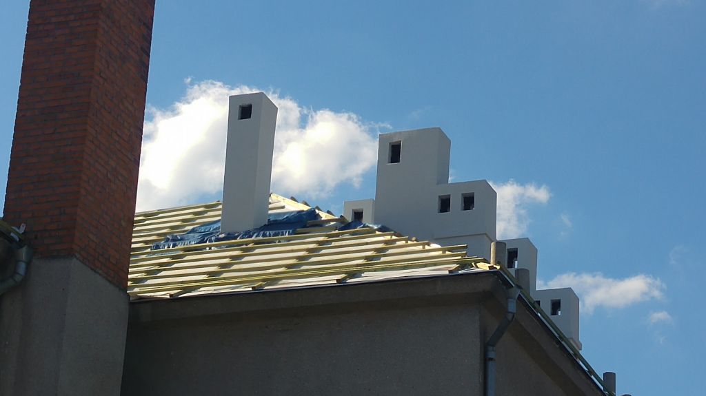 Dokončeny práce na nové střeše "Obecního domu". Nová krytina, omítnutí komínů a ventilaček, zaplechování a vše co s tím souvisí.